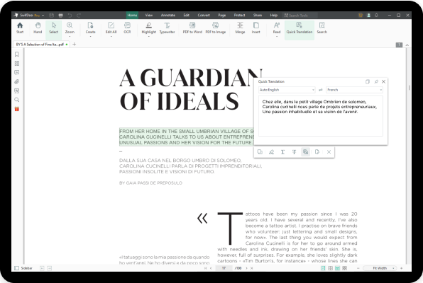 PDF-vertaling is handig als uw ontvangers verschillende talen spreken. Nu hoeft u geen tijd te besteden aan het zoeken naar een PDF-vertaler. Met SwifDoo PDF kunt u de geselecteerde woorden of zinnen rechtstreeks vertalen met een enkele tik van uw vinger.